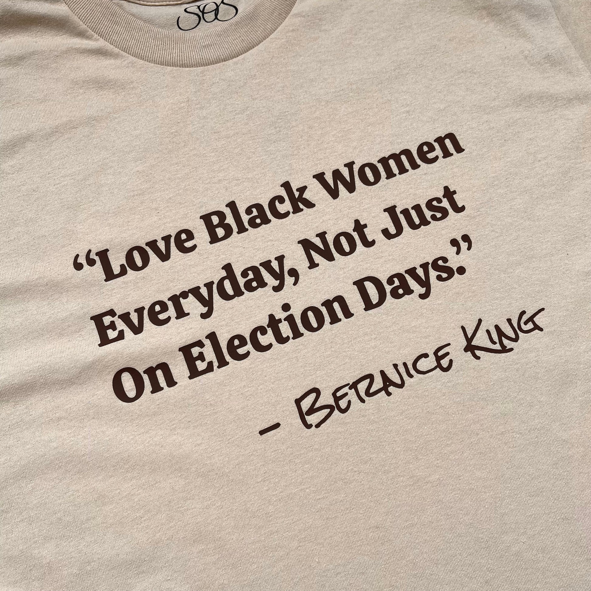 An iconic quote by Bernice King in chocolate, on a comfortable sand tan (unisex) t-shirt. - Unisex fit, we suggest sizing down for a tighter fit.