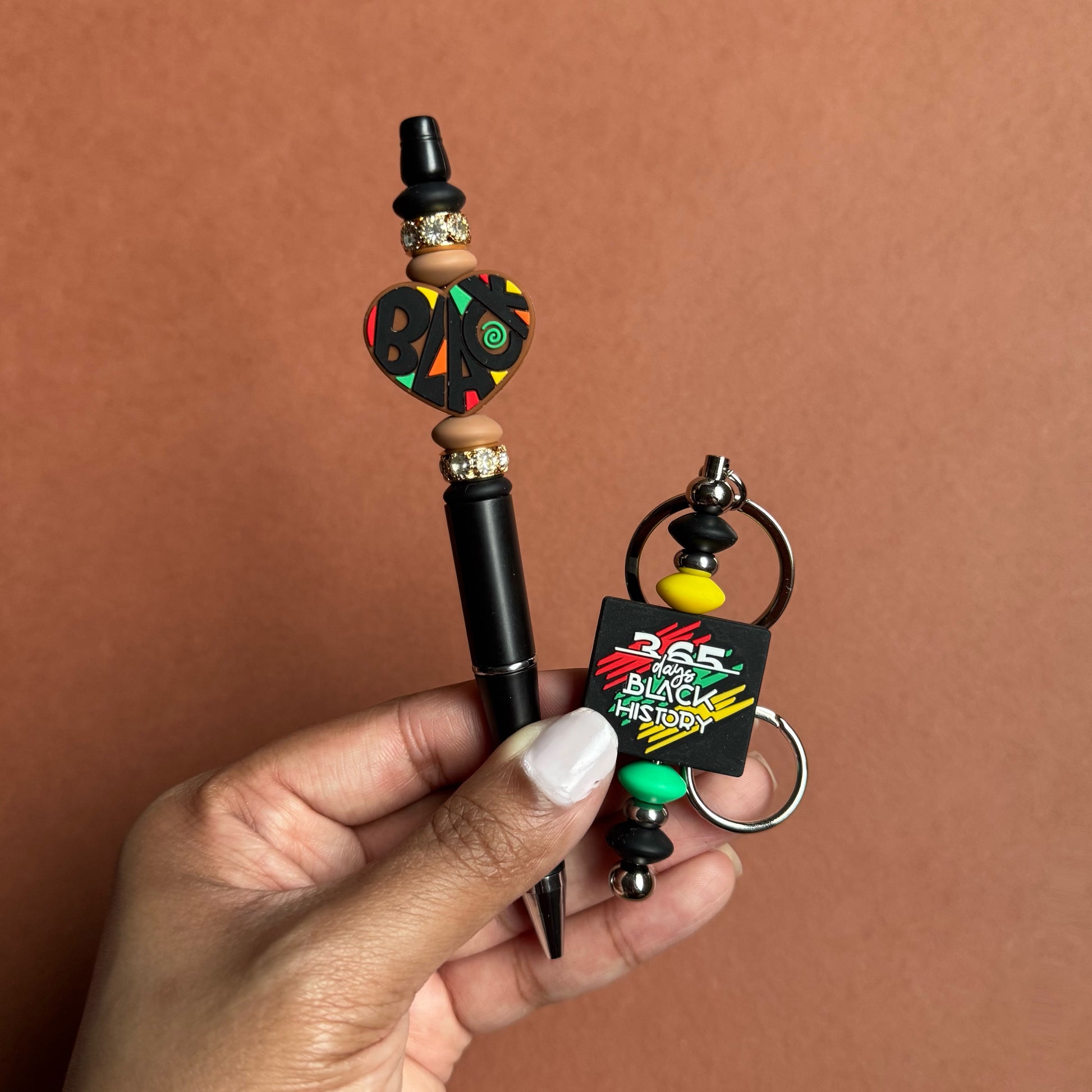 A beaded pen made with silicone beads and a “black” focal bead. This pen writes in black ink and includes an extra ink insert.