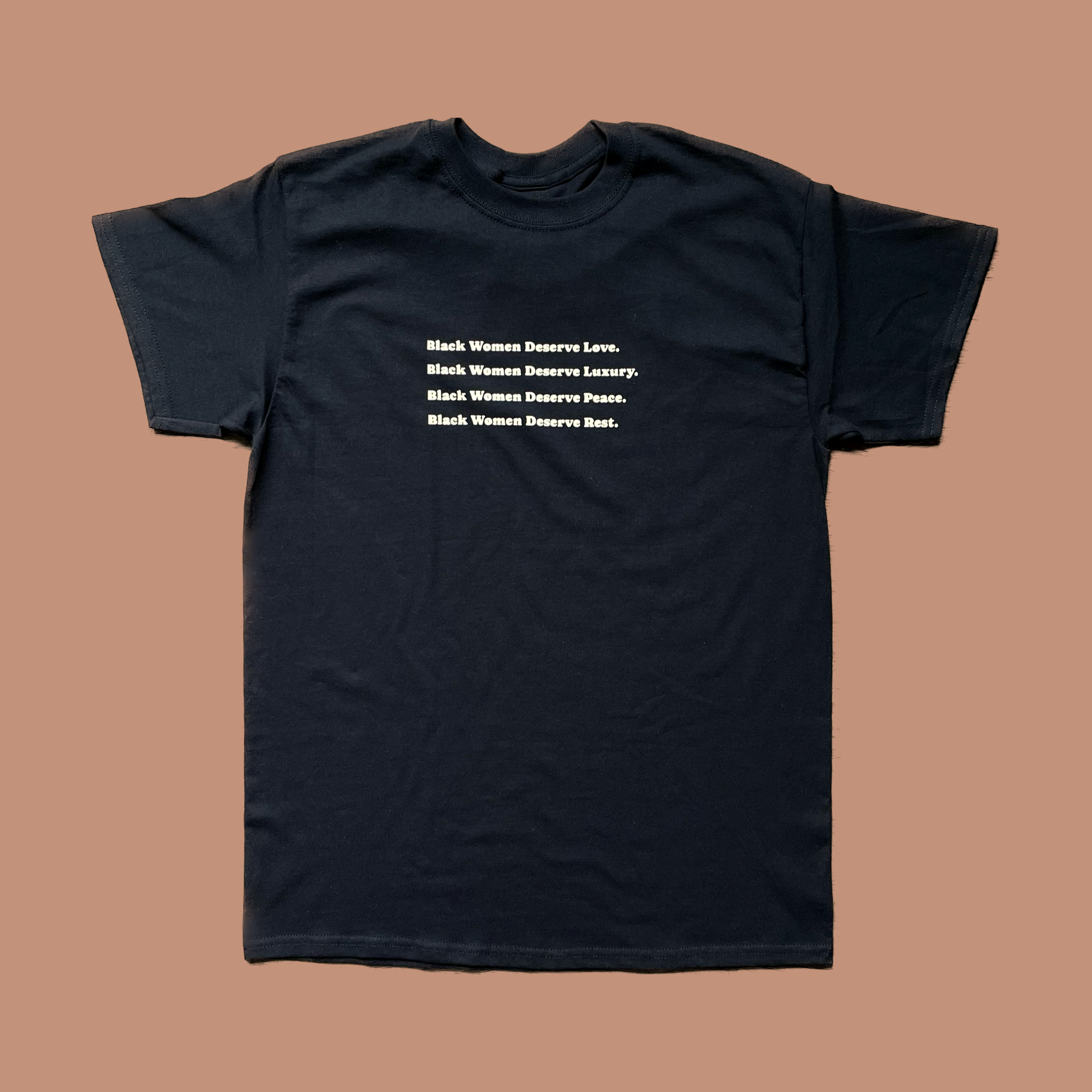 Our ‘Black Women Deserve: Love, Luxury, Peace, Rest’ design in cream on a black oversized (unisex) t-shirt.