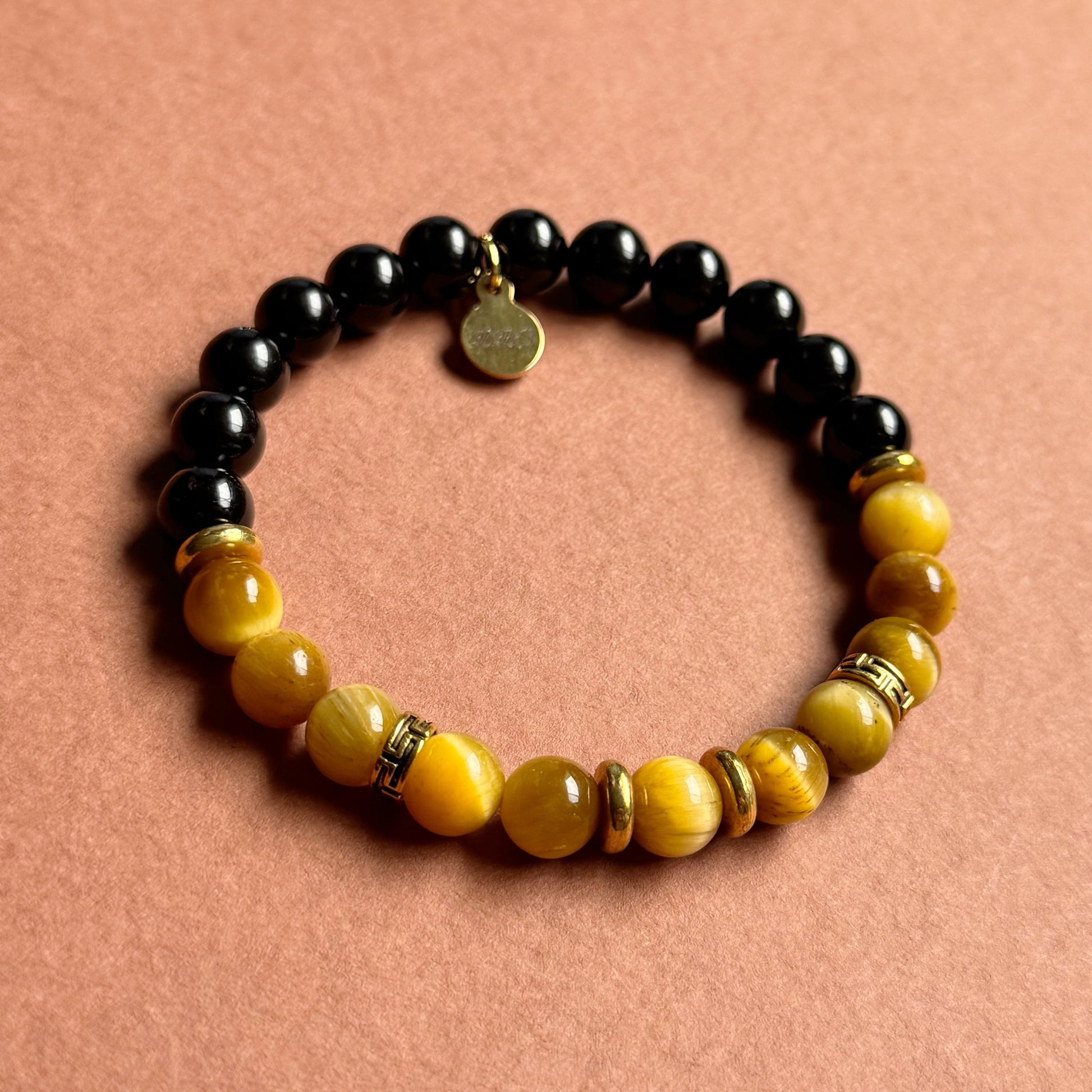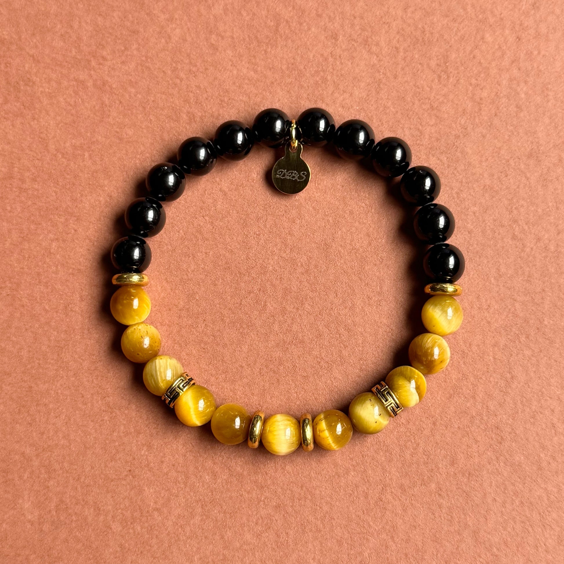 An exclusive SOS x Designs By Sanabria collaboration. Handcrafted gemstone bracelet created with 8mm Golden Tiger Eye Gemstone beads, Black Obsidian Gemstone beads and gold accents spacers with a gold stainless steel DBS charm.