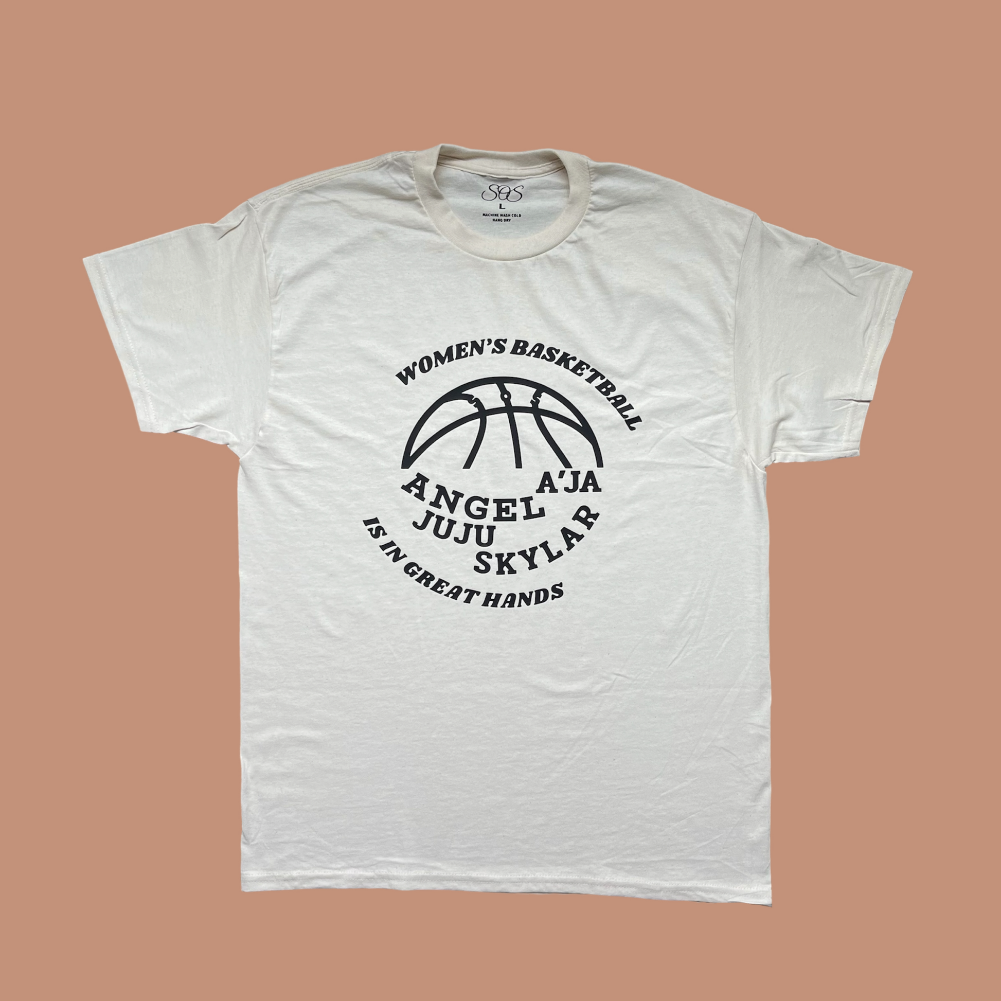 Our ‘Women’s Basketball Is In Great Hands’ design on an oversized natural tan (unisex) t-shirt. ‘Women In Sports’ Collection! This collection celebrates and honors the achievements of girls and women in sports. It’s time to acknowledge, support and protect gender equality even more.