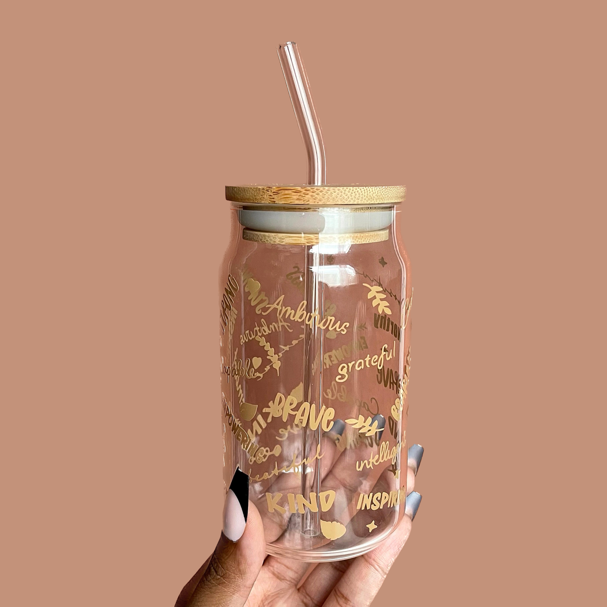 A 16 oz glass can cup with bamboo lid and angled glass straw.