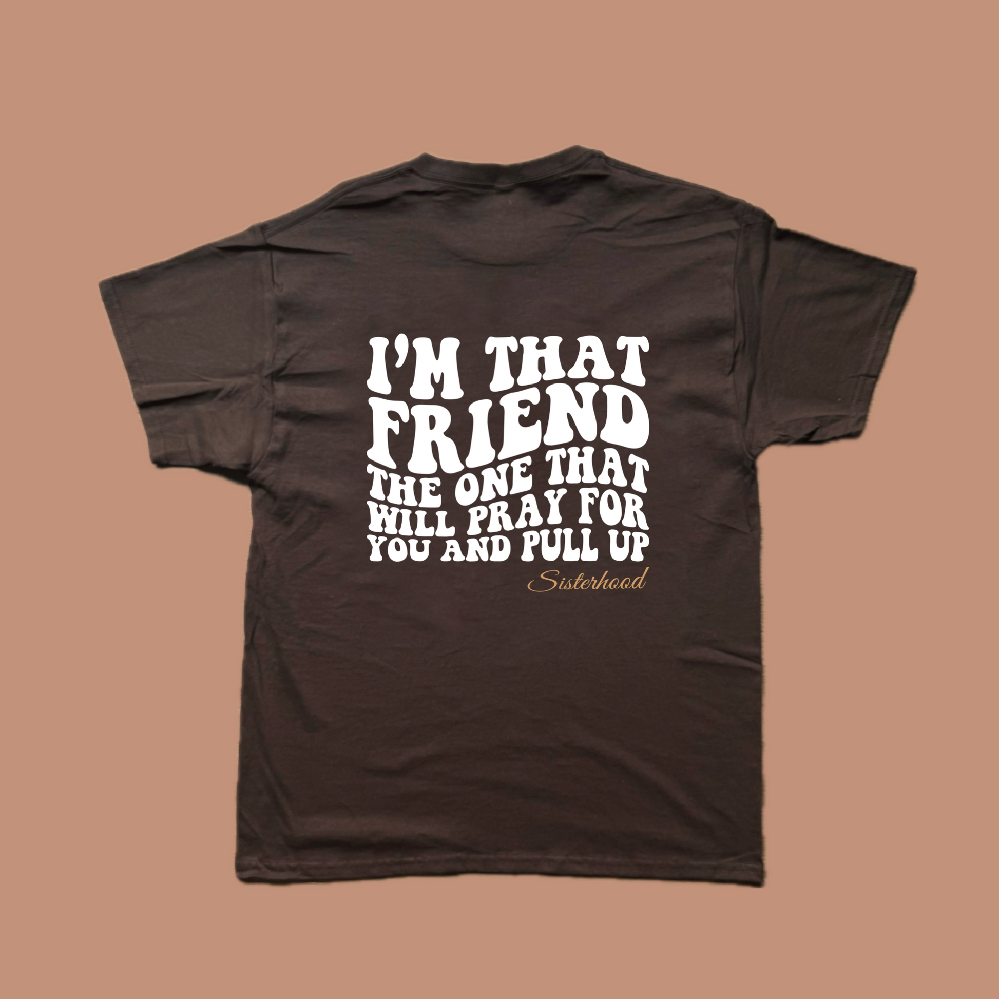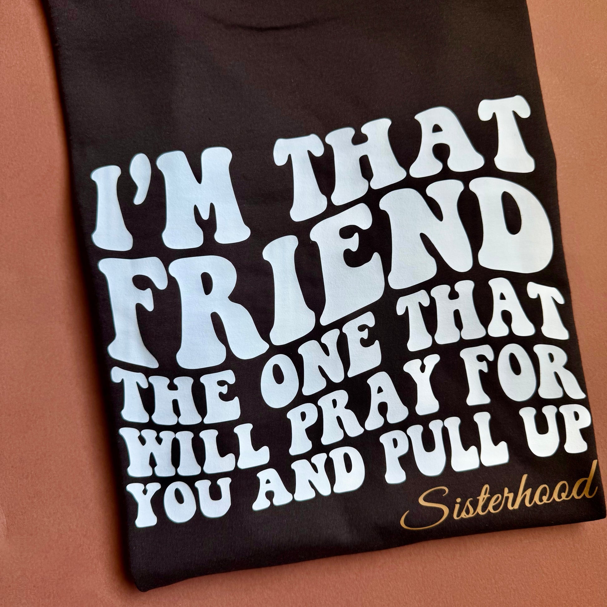 Our “I’m that friend. The one that will pray for you and pull up” design on a dark chocolate brown oversized (unisex) t-shirt.