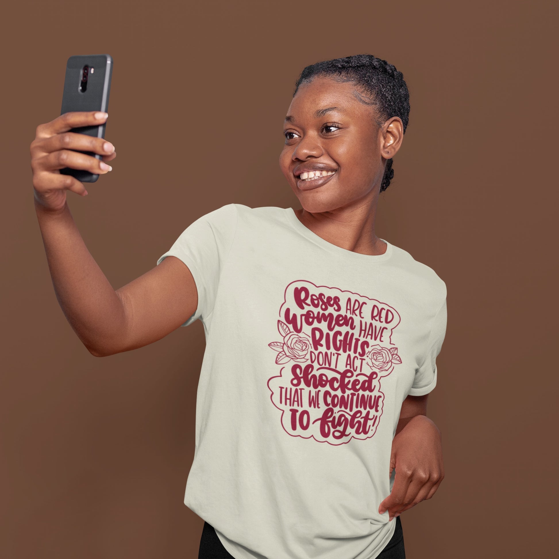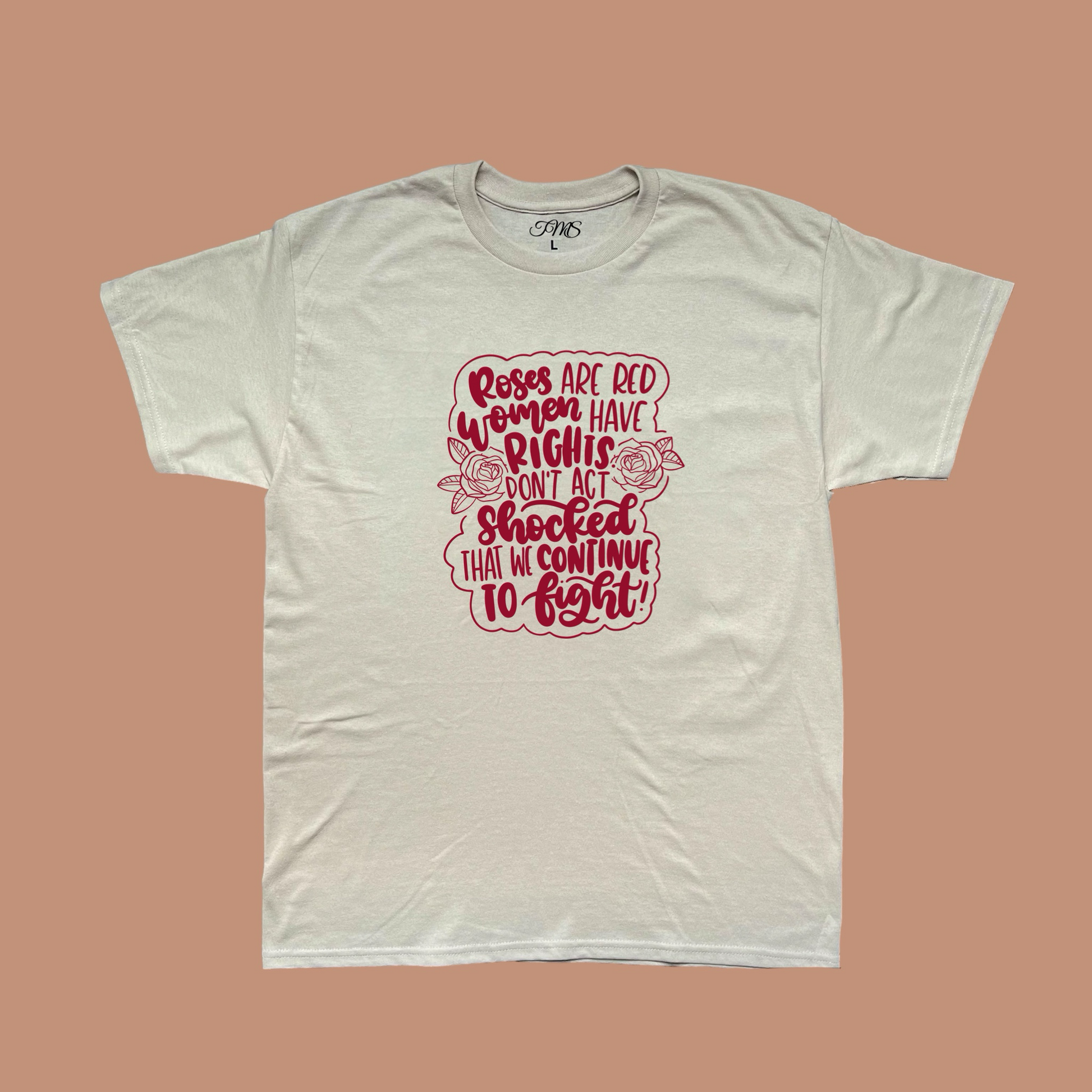 Our “Roses are red women have rights. Don’t act shocked that we continue to fight!” design on a comfortable (unisex) sand t-shirt. - Unisex fit, we suggest sizing down for a tighter fit.