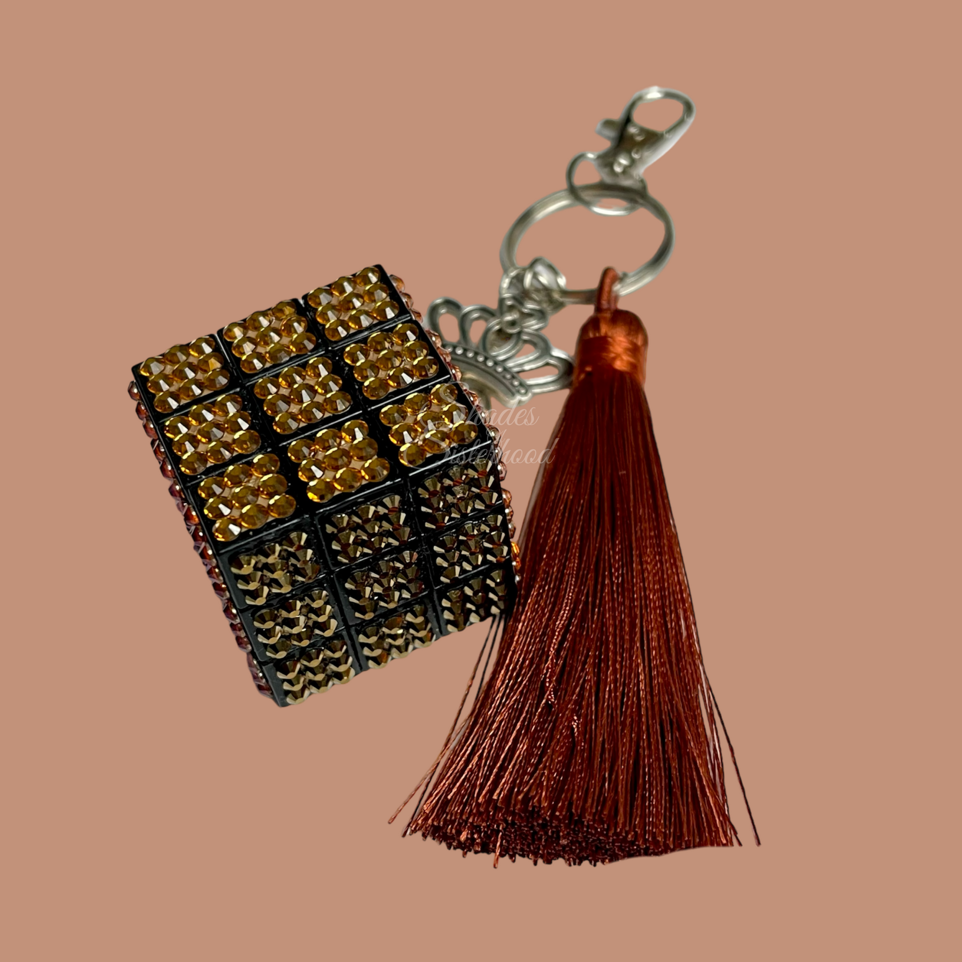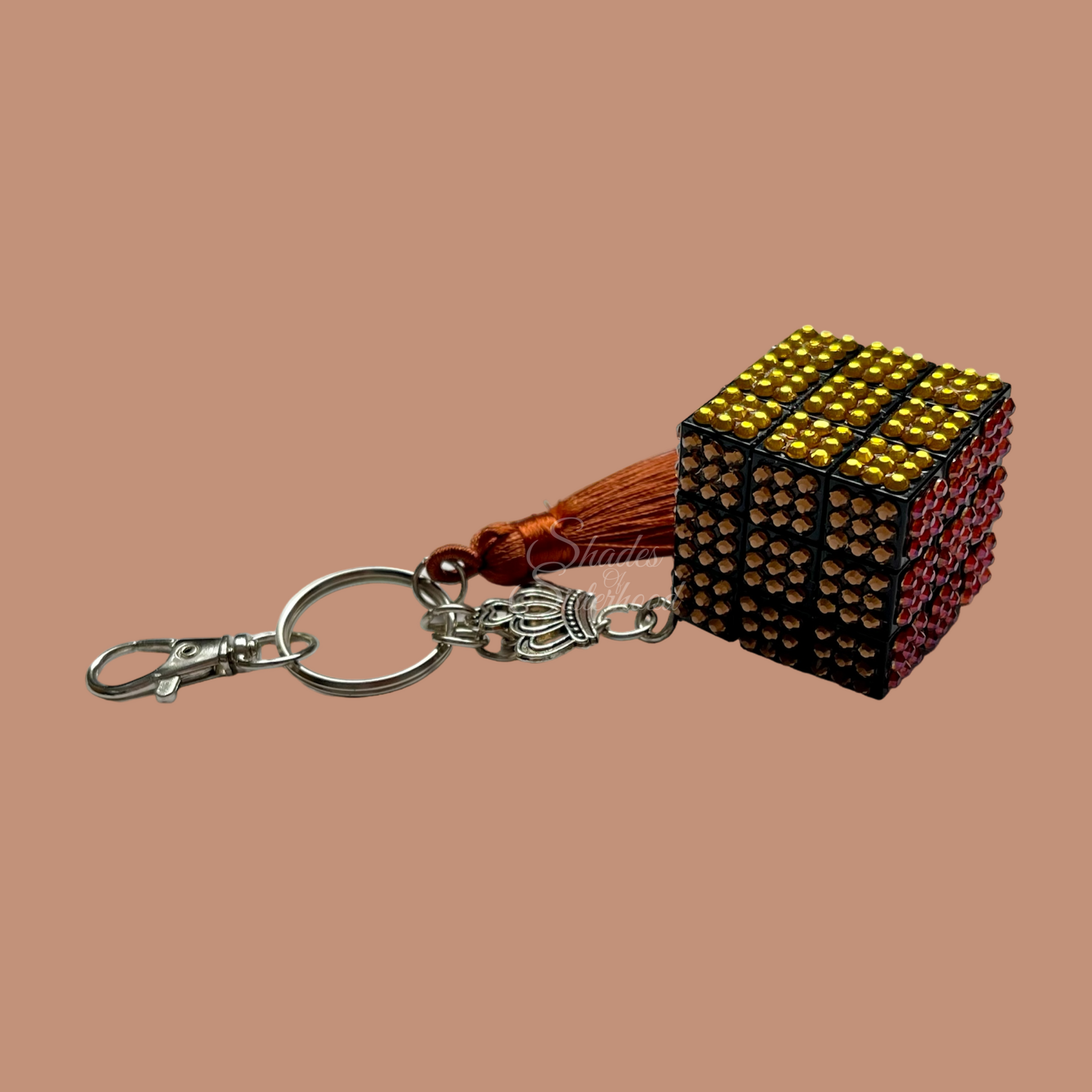 A ‘Designs By Sanabria’ Rubik's Cube keychain exclusively designed for SHADES OF SISTERHOOD comprised of various shades of luxurious Austrain Crystals.