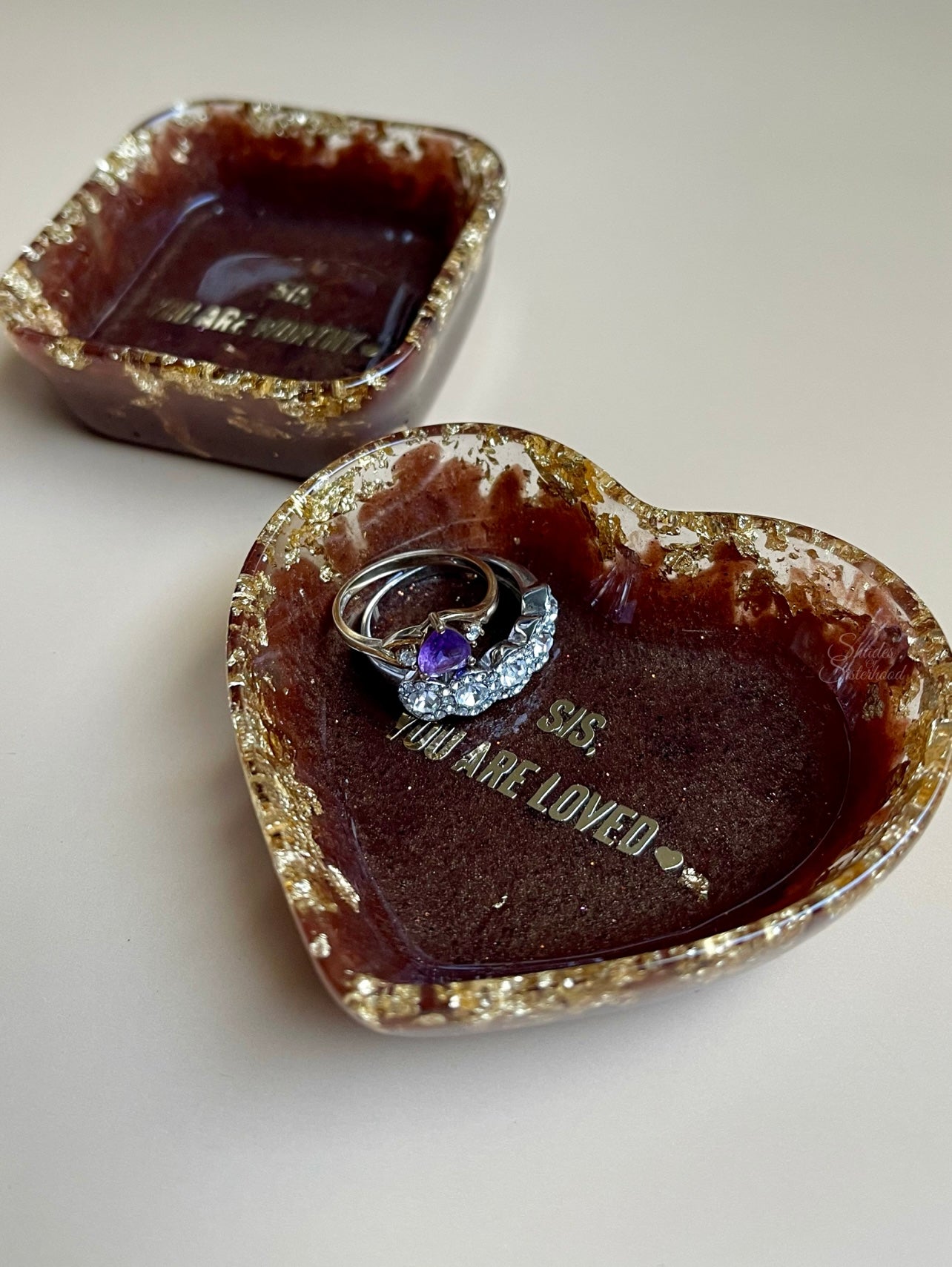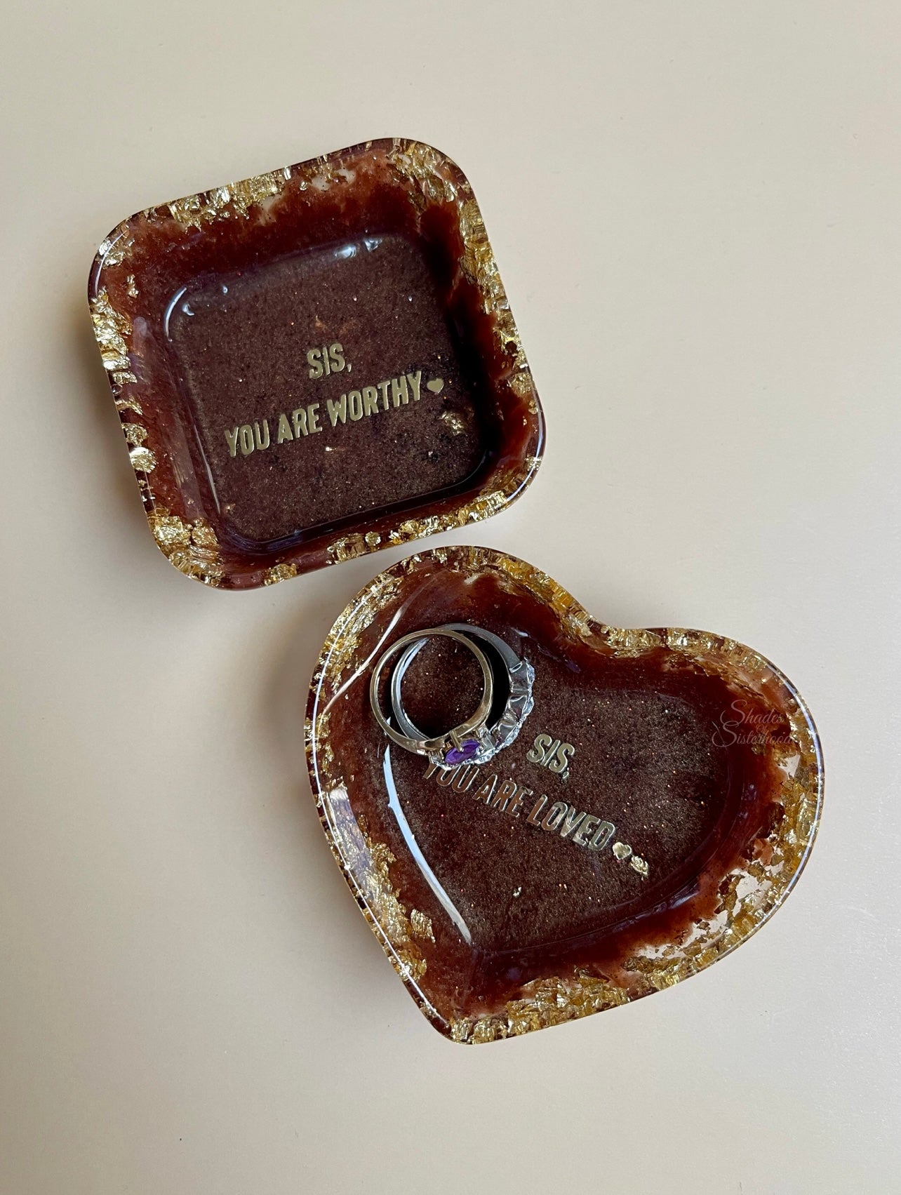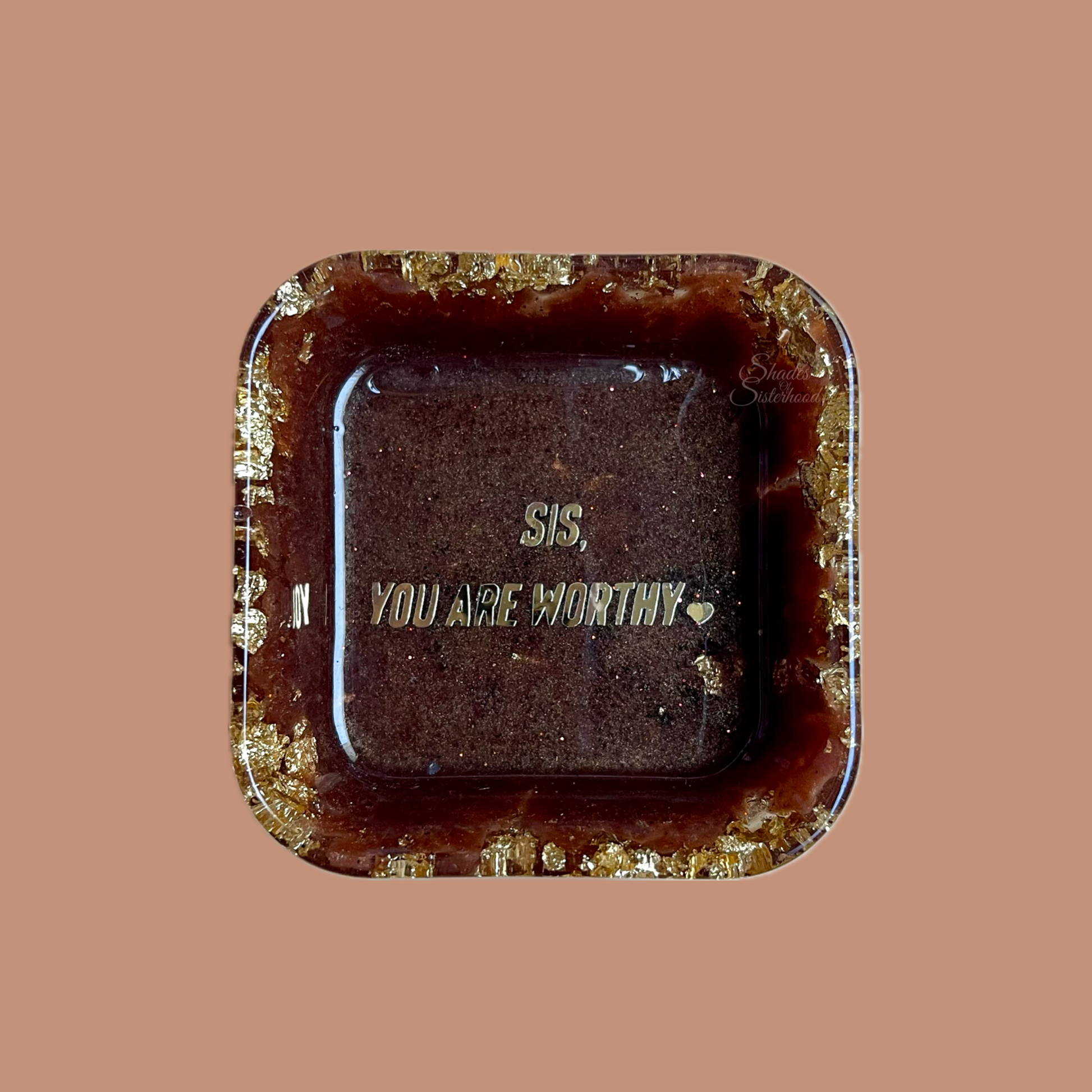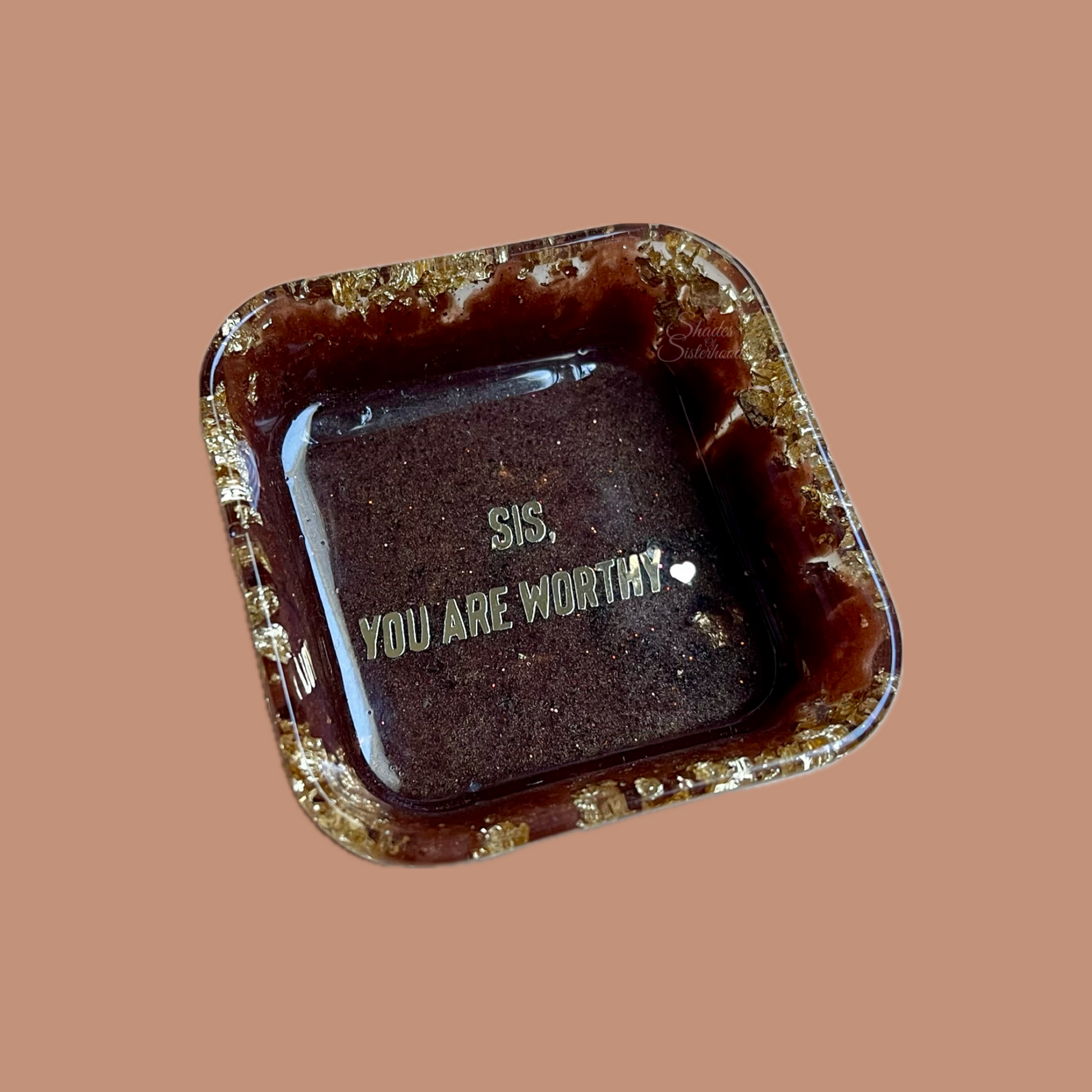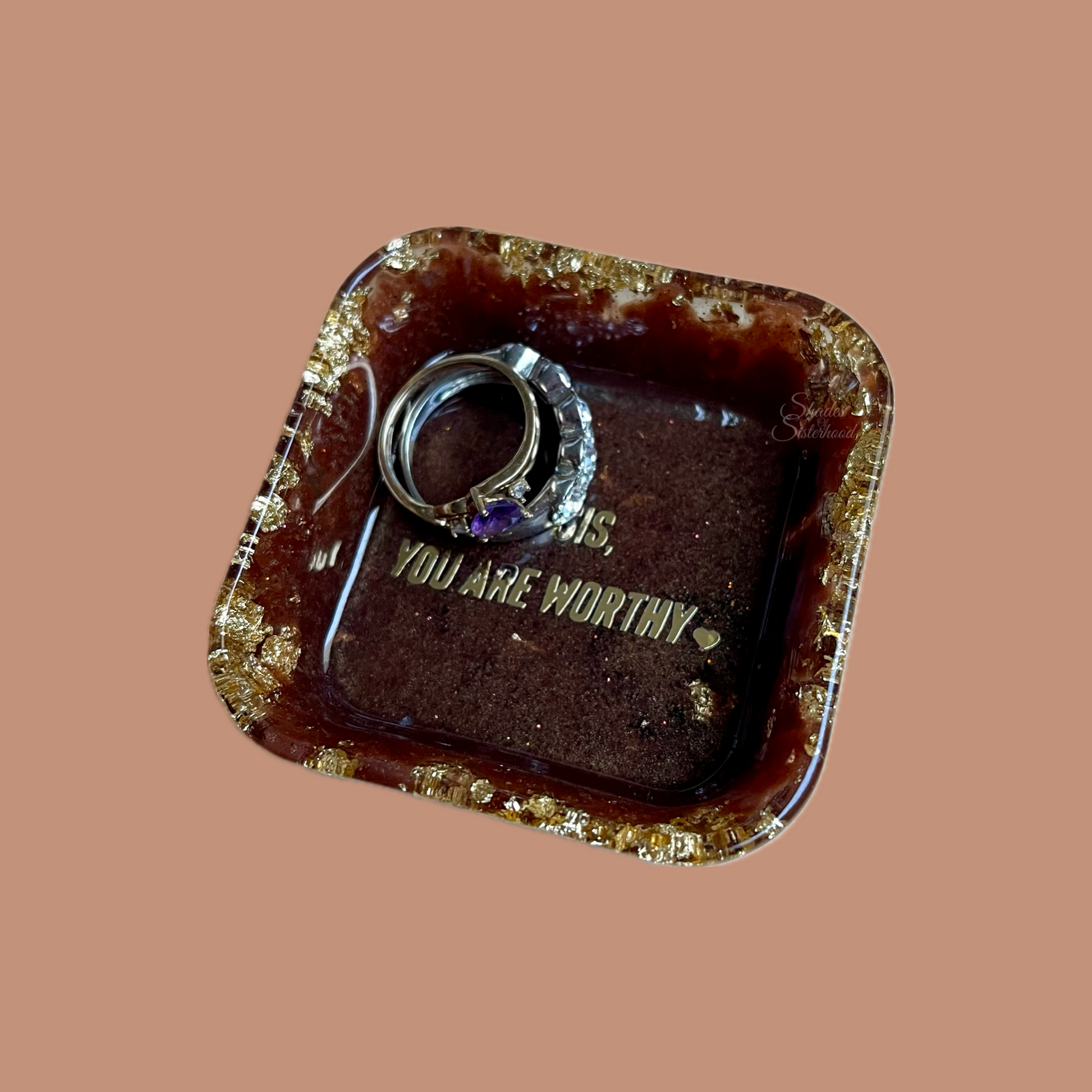 An exclusive square shaped “Sis, You Are Worthy” jewelry/trinket tray in brown and gold.