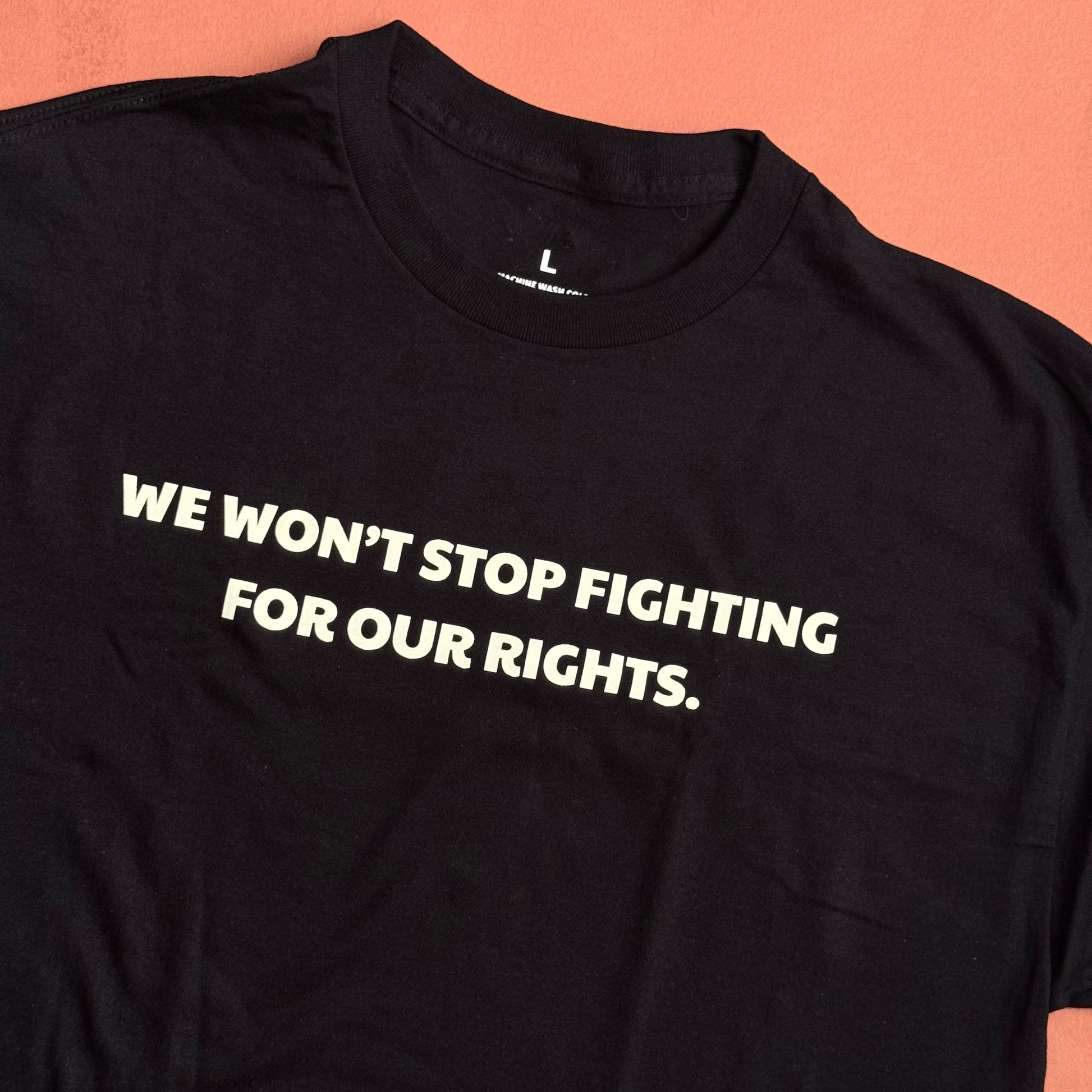 Our “We Won’t Stop Fighting For Our Rights.” design in cream with important dates on back, on a black comfortable (unisex) t-shirt. - Unisex fit, we suggest sizing down for a tighter fit.