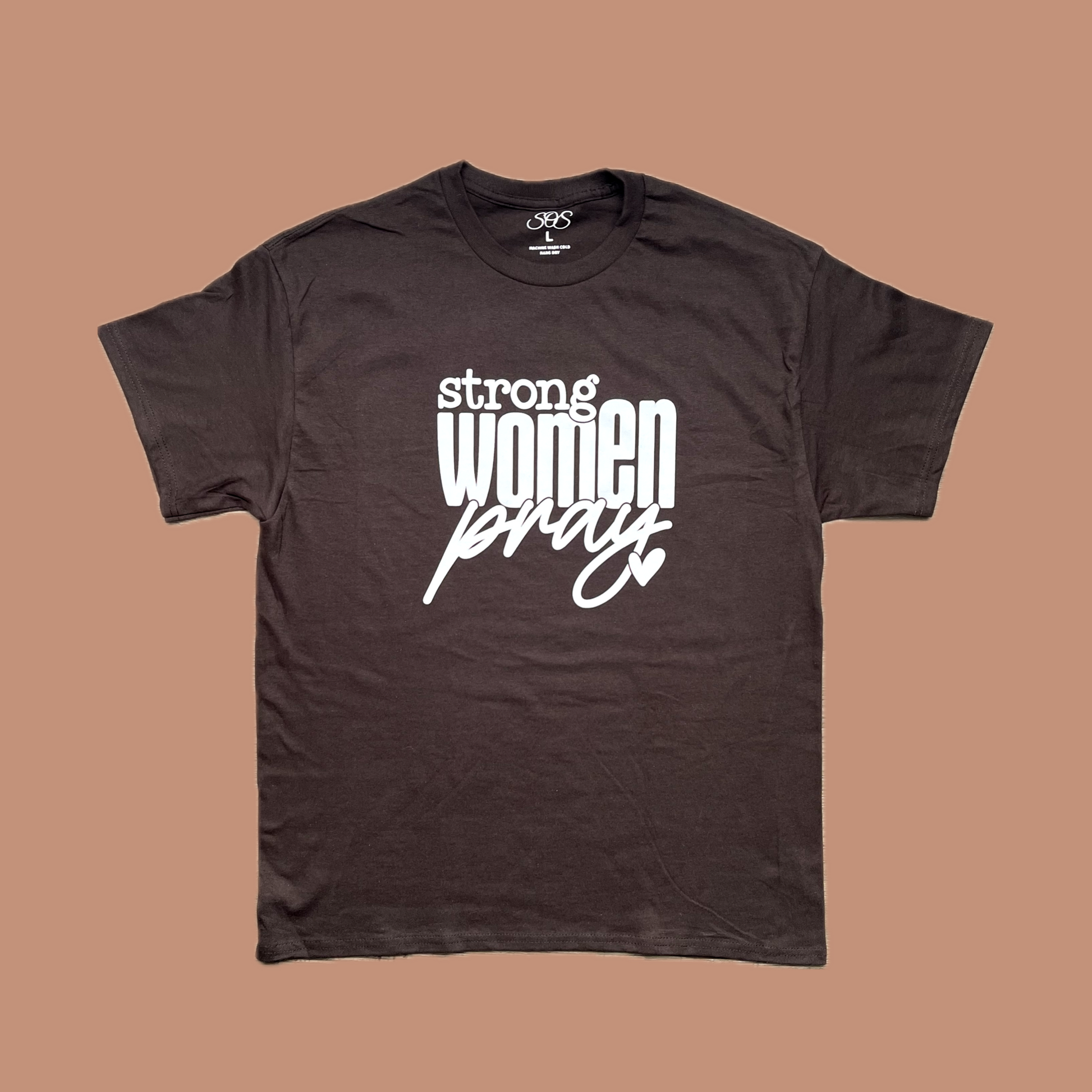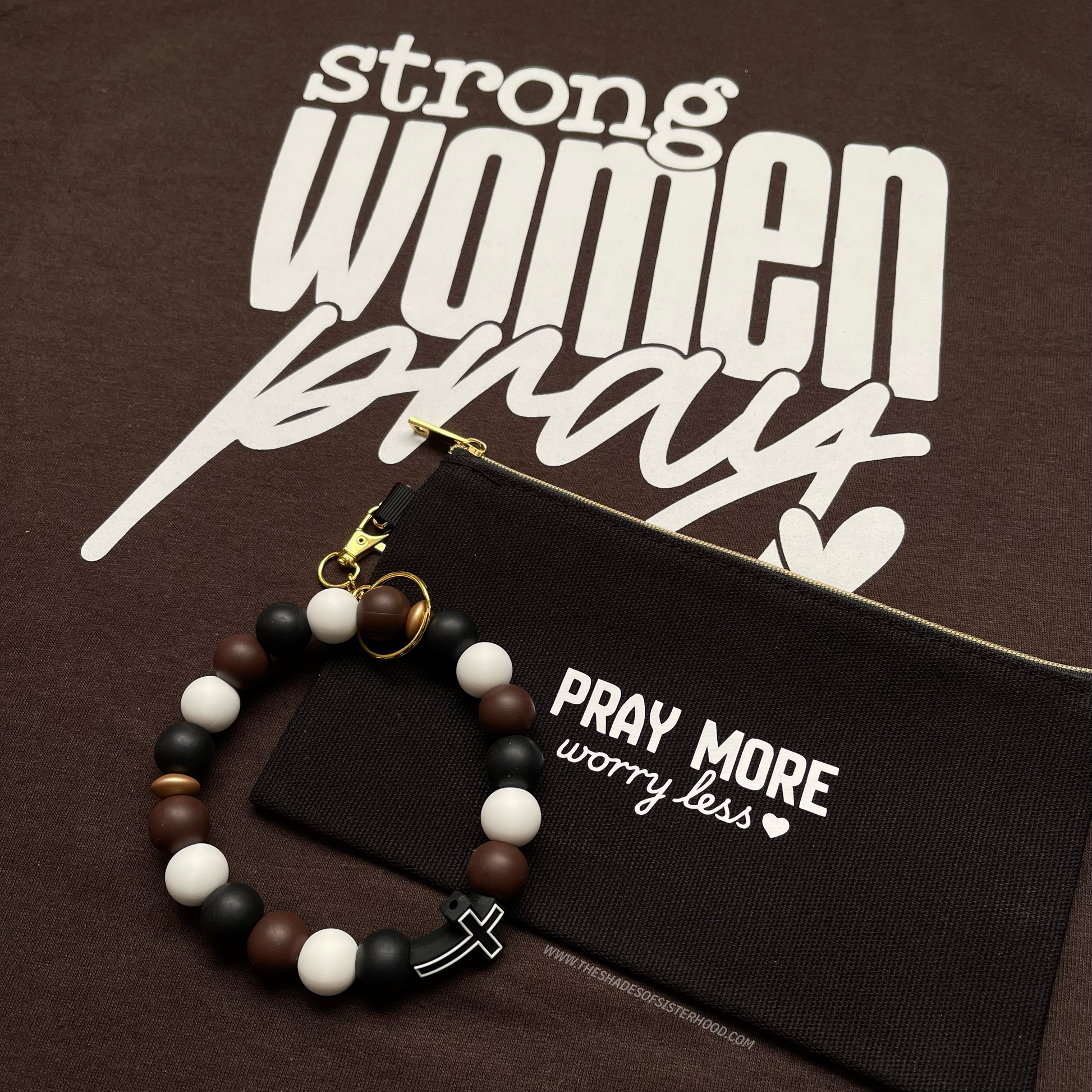 Hurry, No Restocks On This Tee! Our ‘Strong Women Pray’ Faith Bundle that includes an oversized dark chocolate brown comfortable (unisex) t-shirt, silicone wristlet and zip storage pouch. - Unisex fit, we suggest sizing down for a tighter fit.