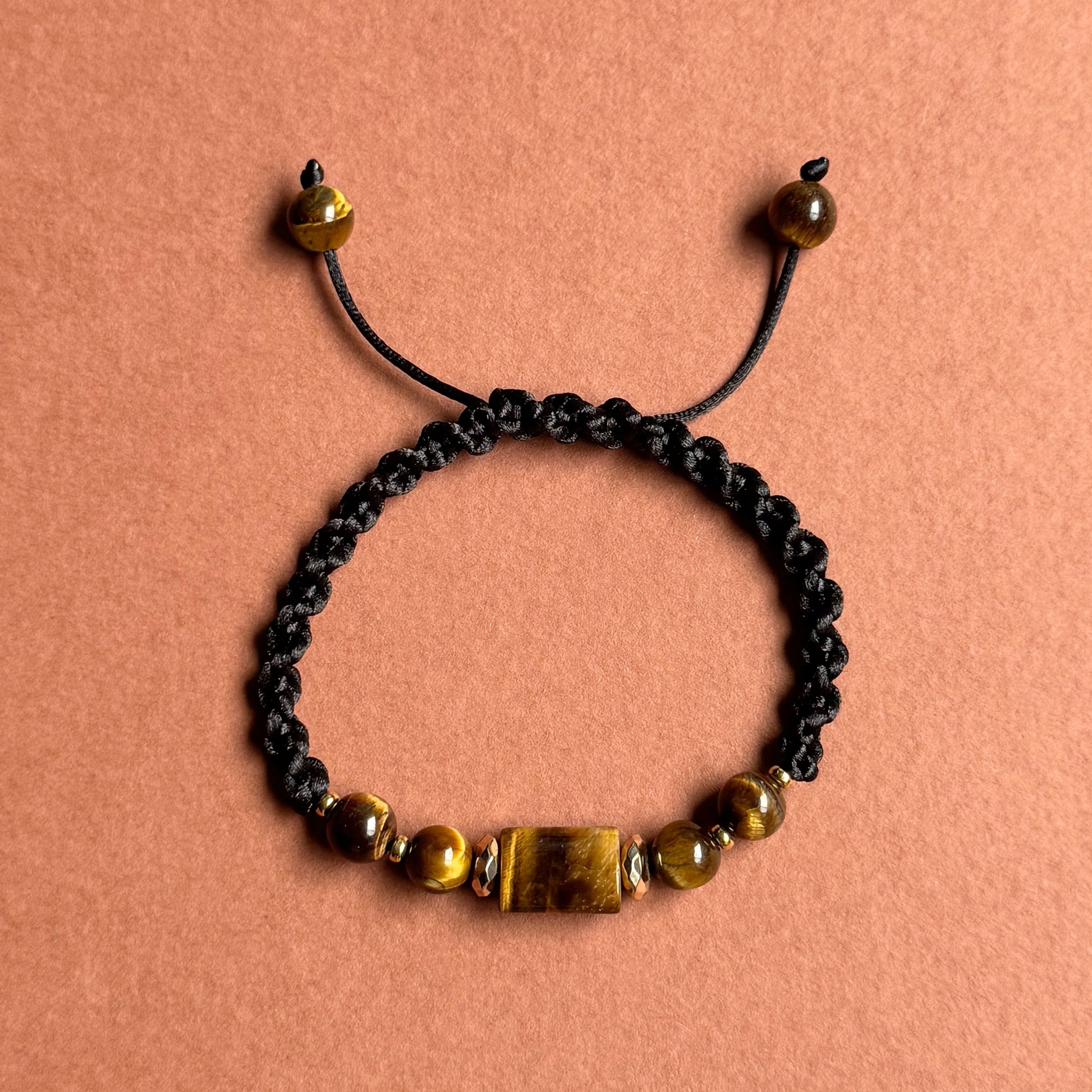 An exclusive SOS x Designs By Sanabria collaboration. Handcrafted gemstone shamballa twist style bracelet created with 8mm Tiger Eye Gemstone beads, rectangle Tiger Eye Gemstone, gold accents on a nylon cord.